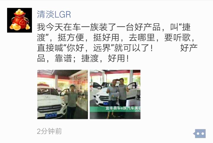 “我今天在車一族裝了一臺(tái)好產(chǎn)品,叫‘捷渡’,挺方便,挺好用,去哪里,要聽歌,直接喊‘你好,遠(yuǎn)界’就可以了!好產(chǎn)品,靠譜;捷渡,好用!”一位車主在購買了之后,對(duì)此在朋友圈贊不絕口。