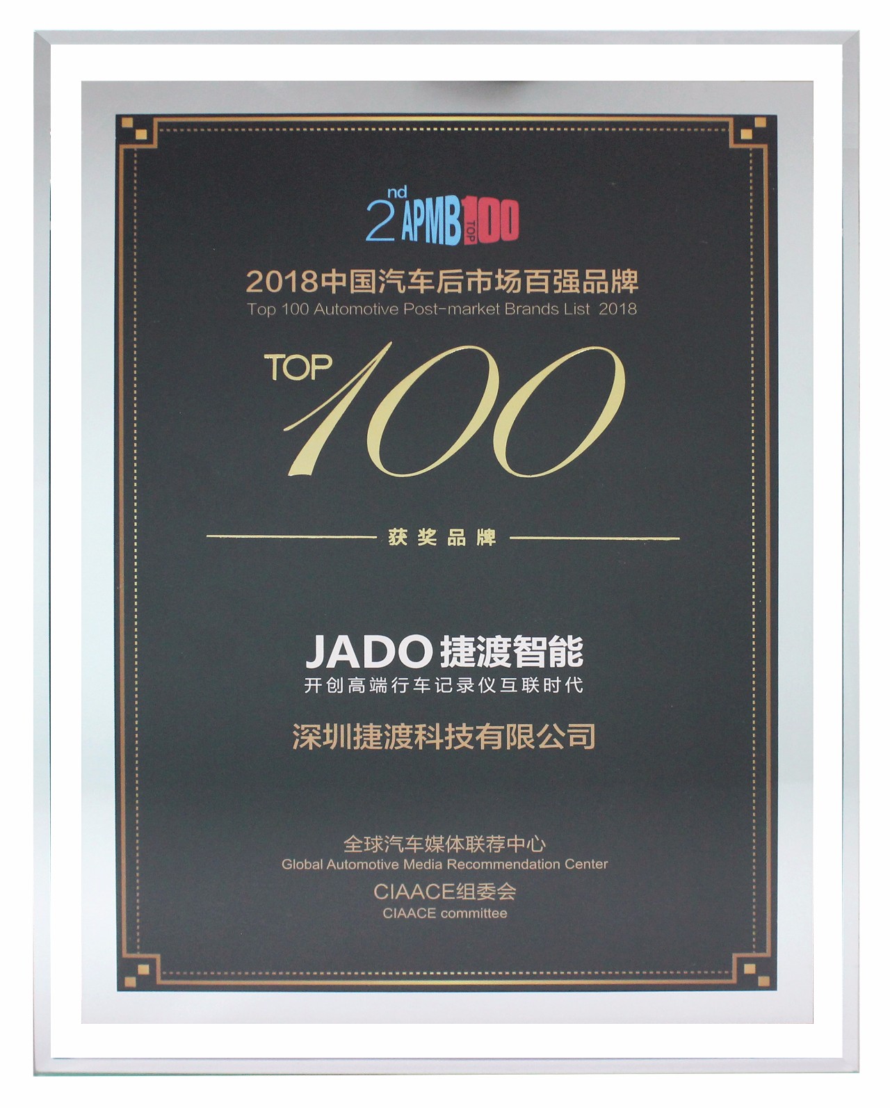 2018年6月21日,由雅森國際攜手中國汽車工業(yè)協(xié)會、中國對外貿(mào)易廣州展覽總公司,以及全球權(quán)威發(fā)榜機構(gòu)共同發(fā)起的《2018第二屆汽車后市場百強品牌榜》評選結(jié)果重磅出爐,國內(nèi)領(lǐng)先的高端行車記錄儀品牌JADO捷渡智能(中國),憑借多樣化的產(chǎn)品和創(chuàng)新的技術(shù),強勢登榜!與3M、奇虎360、統(tǒng)一等汽車后市場領(lǐng)域知名企業(yè)同期列入百強榜單,這也是業(yè)界對JADO捷渡智能(中國)在行業(yè)地位、創(chuàng)新性、成長性、發(fā)展?jié)摿Φ确矫娴母叨日J可。