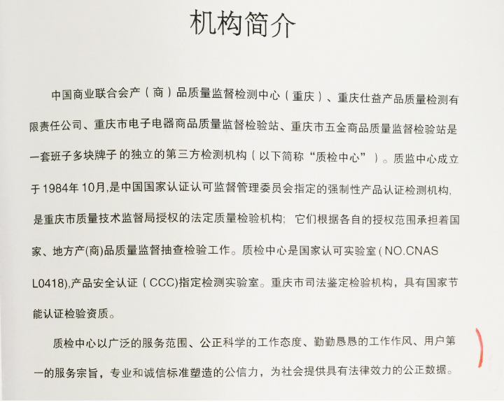 中國商業(yè)聯(lián)合會產(chǎn)(商)品質(zhì)量監(jiān)督檢測中心(重慶)、重慶仕益產(chǎn)品質(zhì)量檢測有限責任公司、重慶市電子電器商品質(zhì)量監(jiān)督檢驗站、重慶市五金商品質(zhì)量監(jiān)督檢驗站是一套班子多塊牌子的獨立的第三方檢測機構(gòu)(以下簡稱“質(zhì)檢中心”)。質(zhì)檢中心成立于1984年10月,是中國國家認證認可監(jiān)督管理委員會指定的強制性產(chǎn)品認證檢測機構(gòu),是重慶市質(zhì)量技術(shù)監(jiān)督局授權(quán)的法定質(zhì)量檢驗機構(gòu),他們根據(jù)各自的授權(quán)范圍承擔著國家、地方產(chǎn)(商)品質(zhì)量監(jiān)督抽查檢驗工作。質(zhì)檢中心是國家認可實驗室(NO.CNASL 0418)、產(chǎn)品安全認證(CCC)指定檢測實驗室。重慶市司法鑒定檢驗機構(gòu),具有國家節(jié)能認證檢驗資質(zhì)。質(zhì)檢中心以專業(yè)和誠信標準塑造的公信力,為社會提供具有法律效力的公正數(shù)據(jù)。